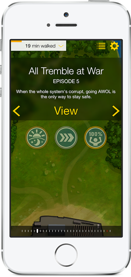 The Walk is a smartphone fitness game and audio adventure released on 11 December 2013. It combines exciting gameplay with a high-octane thriller story, encouraging players to walk more every day. When you're playing The Walk, every single step counts in a journey that will save the world.With 65 episodes containing intricate, fully-illustrated maps, 800 minutes of audio story and hundreds of collectible items to explore the world of the story, The Walk is more than just a pedometer — it's a way to turn walking into a journey, a challenge, and a rip-roaring adventure. And you can use The Walk whatever your level of fitness or mobility, thanks to the game's 'adaptive fitness' system which adjusts to your own fitness levels and gives rewards for gradually increasing how much you move every day.